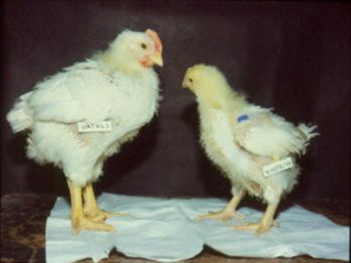 患病雞羽毛粗亂,相對(duì)正常雞個(gè)體明顯偏小,雞爪蒼白(左側(cè)為對(duì)照