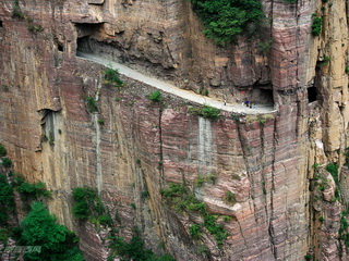 太行山由于地殼運(yùn)動(dòng)形成了斷裂,幾乎是垂直而下,山谷往往是萬丈深淵。掛壁公路就是在這樣的絕壁上開鑿出來的。如今,就算是走在掛壁公路上,看看腳下不見底的深谷,都會(huì)不寒而栗,難以想象當(dāng)初郭亮村的村民是以何等的勇氣開鑿出了這樣一條人間奇跡!